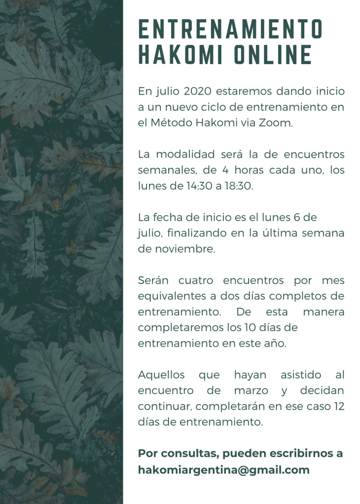 La modalidad multinivel de este entrenamiento hace más rica la calidad de las experiencias e intercambios de los que nos nutrimos y aprendemos, por lo que todas las personas interesadas son bienvenidas. También sus preguntas e inquietudes son bienvenidas. Pueden informarse en www.hakomiargentina.com